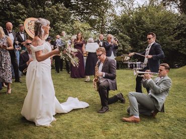 Welcome to Cheshire Roaming Band, your go-to provider for unforgettable live brass band music for weddings, events, and celebrations across Cheshire and the surrounding areas. Our talented four-piece brass band delivers vibrant, high-energy performances, combining timeless classics with contemporary hits, all tailored to suit your event. As a fully acoustic and mobile ensemble, we specialise in creating interactive experiences, moving seamlessly through your venue to engage with your guests and bring every corner of your celebration to life.